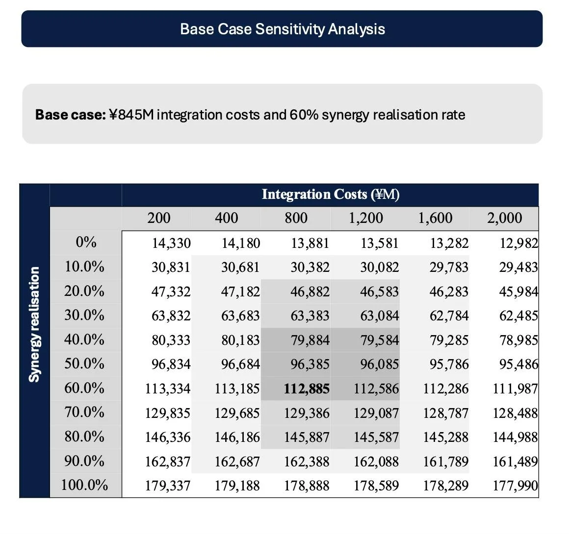 CRI’s valuation underscores the attractiveness of the proposed transaction. The DCF analysis yields a bear-case valuation of ¥2,158 per share, a base-case valuation of ¥4,356 and a bull-case valuation of ¥6,613, with a weighted average of ¥4,371 per share. This weighted valuation represents approximately 385% upside versus CRI’s standalone levels, reflecting both intrinsic value and strategic scarcity.