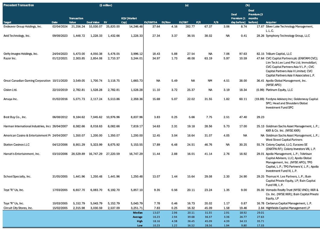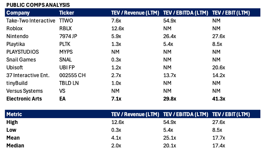 This valuation is further corroborated by precedent transaction analysis. Strategic and sponsor-led acquisitions of scaled digital content, interactive media, and platform assets have cleared at elevated EV/EBITDA with median multiples in the high-teens to low-20s. Premiums expand meaningfully for assets with defensible IP, strong community engagement, and long-duration cash flow, characteristics squarely aligned with EA’s operating profile.