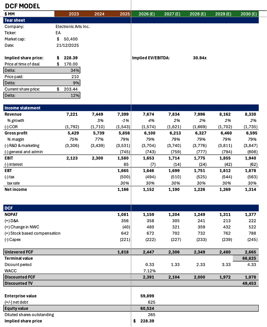 Our intrinsic DCF analysis implies an equity value of $228.39 per share, representing a ~34% uplift to the undisturbed share price at announcement and a ~12% premium to current trading levels. This corresponds to an implied EV/EBITDA multiple of 30.9×, reflecting EA’s high-margin, IP-driven earnings profile, durable live-services cash flows, and long-term growth optionality.
