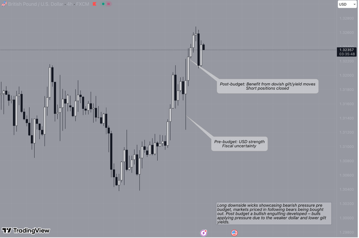Sterling recovered later as markets deemed the Autumn Budget to be fiscally restrained, prompting gilt yields to trade lower from earlier highs.