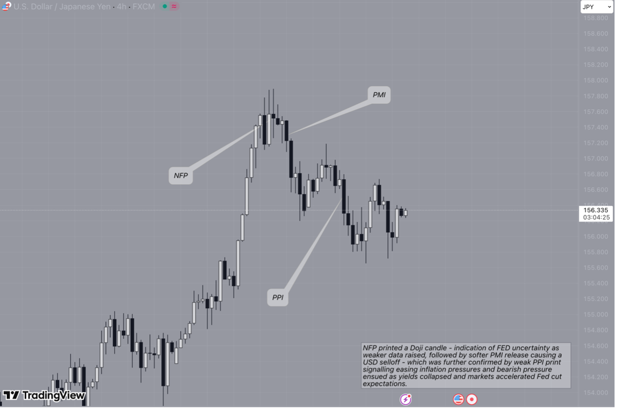 Overall: Dovish repricing of U.S rates, triggered by weak PPI and furthered by falling Treasury yields, caused USD/JPY to trade lower as the Yen benefited from tightening Fed-BoJ rate differentials.