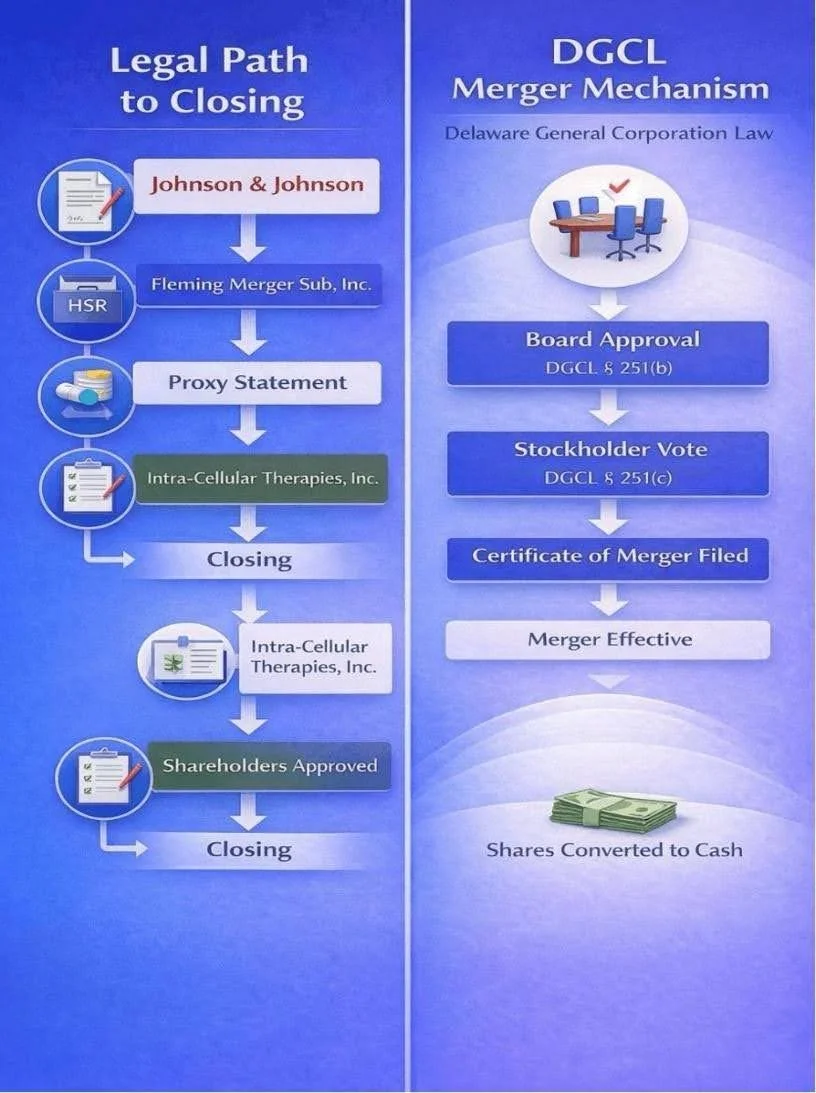 The transaction was executed using a reverse subsidiary merger, a common structure in United States public-company acquisitions. Johnson & Johnson formed a wholly owned acquisition vehicle, Fleming Merger Sub, Inc., which merged with Intra-Cellular Therapies. Following completion of the merger, the acquisition vehicle ceased to exist and Intra-Cellular survived as the legal entity, becoming a wholly owned subsidiary of Johnson & Johnson. This structure allows the target company to retain its corporate existence, including its contracts, regulatory approvals and intellectual property rights, thereby simplifying operational integration. After completion of the transaction, Johnson & Johnson indicated that Intra-Cellular would operate within its Innovative Medicine division, enabling integration into the company's global commercial infrastructure while maintaining scientific continuity.